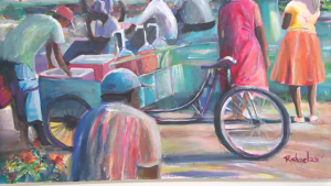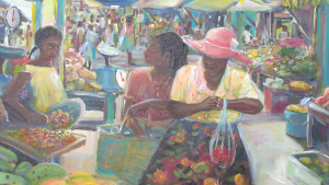 A woman in a bright red sunhat and a colorful skirt buys fruit at the market—an ordinary scene most of us pass by without a second thought. But in the hands of Belizean artist Rachel Heusner and her son, Dean Martin, that fleeting moment becomes something extraordinary. Now hanging on the walls of the Bliss Center for Performing Arts, this painting is just one of thirty pieces in their joint exhibit, “Moments.” The collection transforms everyday Belizean life into vibrant works of art, inviting viewers to pause and appreciate the beauty in the seemingly mundane. Through bold colors and thoughtful brushstrokes, Heusner and Martin remind us that even the simplest moments are worth celebrating.